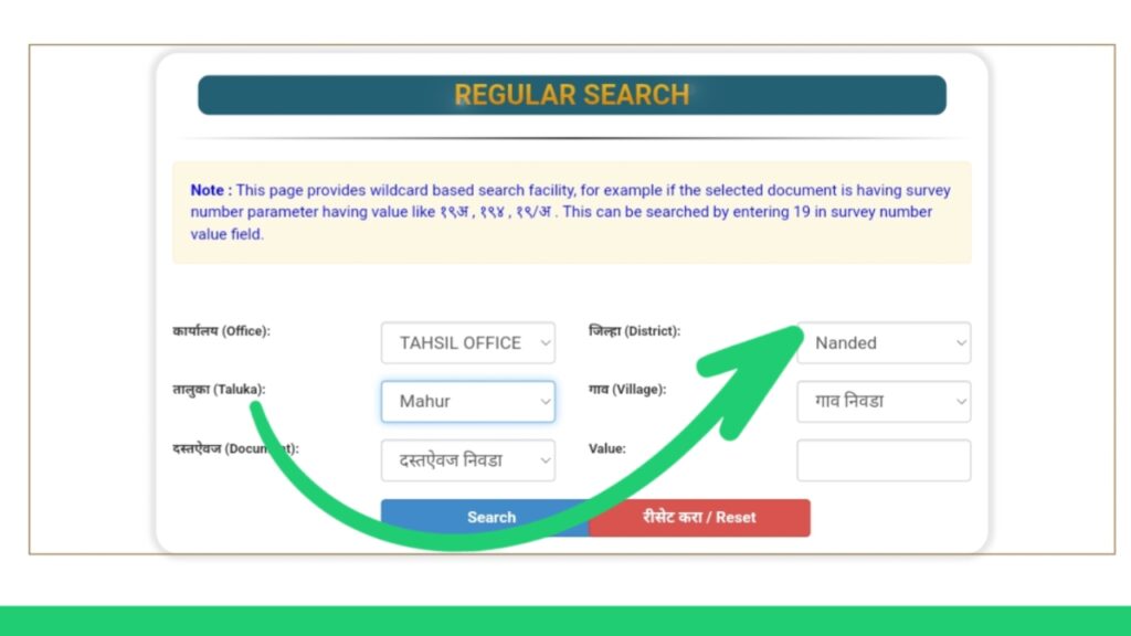 • नोंदणी करून झाल्यानंतर तुम्हाला नांदेड जिल्ह्यातील ज्या जमिनीची जुने दस्तऐवज पाहायच्या आहेत किंवा डाउनलोड करायचे आहेत त्या जमिनीचा सर्वे नंबर, गावाचे नाव, आणि तालुका ही माहिती भरायची आहे.